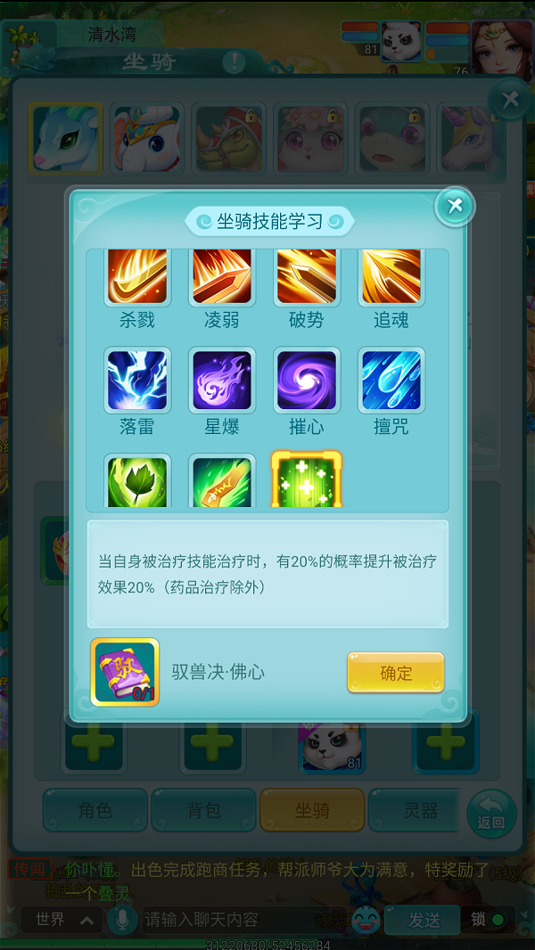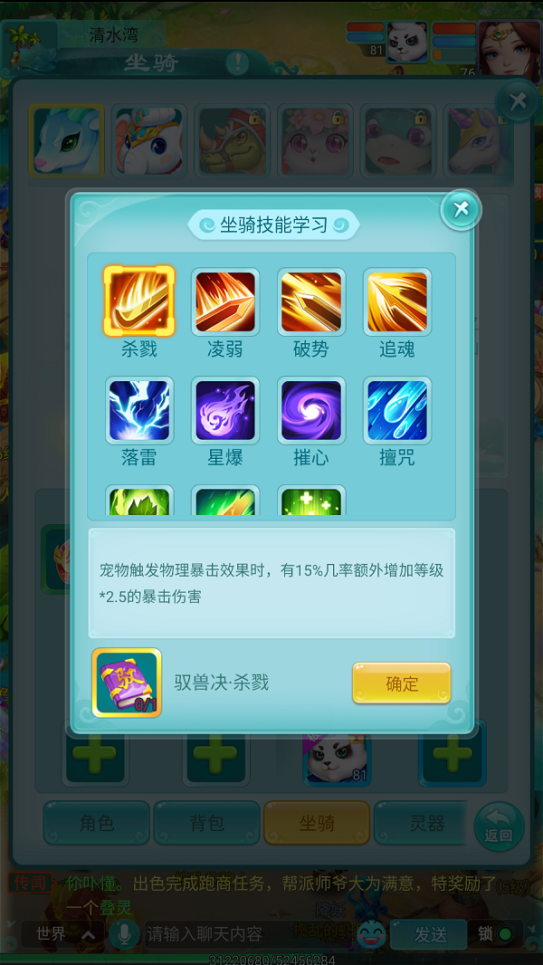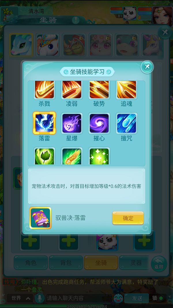 在《逍遥情缘》手游商店的珍宝阁里,有一批售价超贵的道具,那便是驭兽诀,居然要12万金币一本!这些价格比肩最贵高级兽诀的驭兽诀到底有何作用,敢卖这个价格?其实驭兽诀就是坐骑的技能,对统御的宠物有巨大加成,给坐骑学了绝对不亏的。 【价格高昂 但是值得】 游戏中打开坐骑界面,可以看到左下角有两个坐骑技能的格子,驭兽诀学的就是这里面的技能。一只坐骑学习了驭兽诀技能后,被该坐骑统御的宠物就会得到技能的强化,效果都很强力。 驭兽诀技能分为三大类,第一排红色图标的是强化物理宠物的,第二排蓝色图标的是强化法术宠物的,第三排绿色图标的是强化辅助宠物的。每个坐骑都可以学习至多两个驭兽诀技能。 【强化宠物 效果卓著】 驭兽诀技能的效果非常多样,比如这个杀戮,让统御的宠物在触发物理暴击时,有15%的几率额外增加等级2.5倍的暴击伤害,从而打出更高的伤害。培养物理宠物的话,必学这个技能。 再比如这个落雷,让你的法宠在攻击时,可以对首要目标额外增加等级0.6倍的法术伤害。少侠可以培养多只坐骑,学习不同的驭兽诀,再针对性地统御合适的宠物,发挥驭兽诀最大的价值。 更多游戏攻略,请锁定叶子猪《逍遥情缘手游》官方合作专区。 编辑:叶子猪小秘书