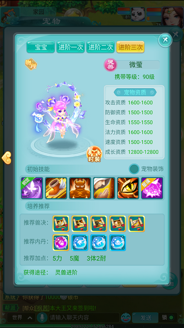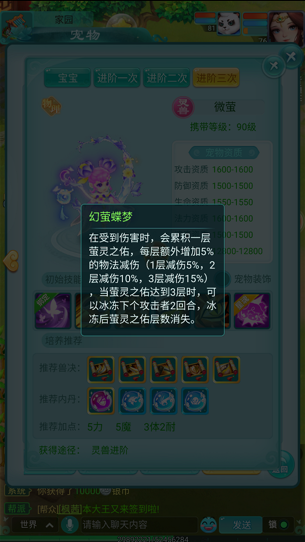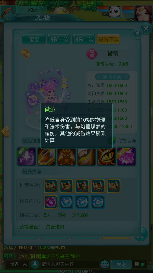 在玩《逍遥情缘》手游的时候,每个人都希望能拥有一只强大的、可依靠的宠物,同时又希望能有一只可爱软萌、看了让人心情舒畅的宠物...其实,这个愿望可以同时实现,那就是培养灵兽微萤!她不仅强大如神兽,外表也是一等一的可爱呢! 【幻梦精灵 可爱仙子】 先看外表,微萤是一个软萌的小女孩,有着粉色的头发,紫色的连衣裙,以及一双玲珑剔透的大眼睛,仿佛幻梦中走出来的精灵。她端坐于一轮弯月之上,全身上下无不散发着可爱的气息。 微萤的资质也非常可观,已经可以跟神兽相比了。在完成了三次进阶后,她的攻击和法力资质都达到了1600的高度,看样子可以走物理路线也可以走法术路线。而且,她的生命资质也很高。 【被动控制 肉度可观】 微萤有一个特殊技能“幻萤蝶梦”,这是一个同时兼顾耐久和控制的被动。效果不仅能叠加双抗,还可以在合适的时机反制攻击方,将它们冰冻住,是游戏中目前唯一一个被动型的控制技。 微萤的星魂技能,主要作用是提升微萤的肉度,可以降低自身受到的伤害,而且这个减伤效果是可以与其他减伤效果累乘计算的。这样一位又肉又能打,而且还可爱的小姑娘,有谁能不爱? 编辑:月光下完美