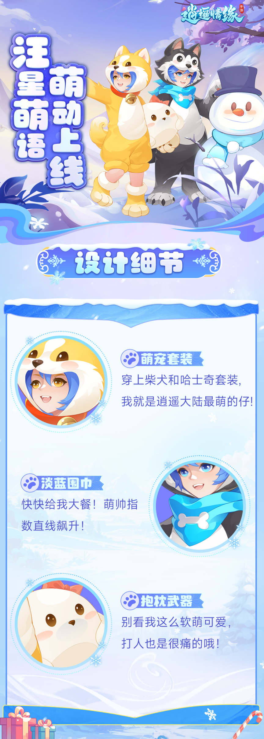 亲爱的少侠们好呀,冰雪节的活动期待嘛!今天更新后,全新的时装就正式上线咯,一起来看看实机效果吧。 男生身着黑色哈士奇套装,女生身着黄色柯基套装,逍遥大陆最萌的少侠们来咯! 手持海豹武器,女款的海豹还有小蝴蝶,更是激萌! 顺带提一句,这套时装与耳鼠坐骑简直是绝配呀,萌上加萌! 紫色 粉色 蓝色 除了原本的颜色之外,汪星萌语还有其他的三种染色,都会在此次版本中一同上线哦 紫色魅惑浪漫、粉色俏皮可爱、蓝色天真无邪,不知哪款更能吸引在座的少侠呢?~ 施法动作 攻击动作 施法时甩出海豹腾空,瞬间电闪雷鸣,释放技能,尽显乐趣~ 攻击则会双手持海豹武器,幻发出电闪光线用力刺出,霸气十足~ *以上仅为爆料版本,请以正式上线内容为准* 关于本次版本的时装,瑶瑶就大致介绍到这边啦,喜欢的少侠赶紧登录游戏获取吧。 更多官方资讯,请锁定叶子猪《逍遥情缘手游》官方合作专区。 编辑:叶子猪小秘书