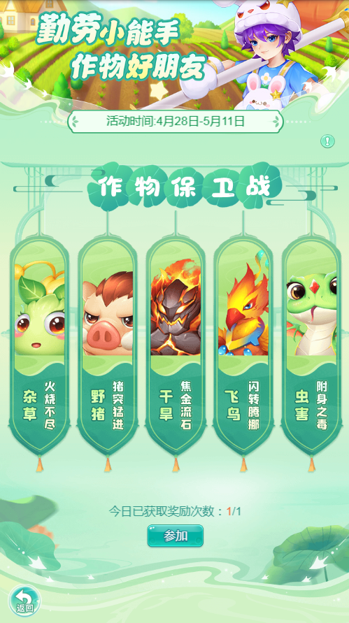《逍遥情缘》手游劳动节全新版本即将到来,会有怎样的特色活动在等待着少侠们呢?今天,我提前拿到了第一手情报,赶快来跟大伙儿分享一下。这个劳动节,就让我们体验新奇的活动玩法,共度一个多姿多彩的五一假期吧。 活动时间:4月28日-5月11日 【劳动最光荣】 活动时间内,玩家每日将接取到新的任务,完成相应任务即可领取劳动奖章。劳动奖章可用于在活动界面内兑换奖励。劳动奖章在活动结束后将无法兑换,请及时兑换。 【点数之争】 活动时间内每天17点-21点,单人前往长安点数之争活动使者处匹配成功后可进入游戏,匹配到的玩家短时间内无法再次匹配到。玩家匹配成功后,初始获得十张卡牌,对应1到10点,每轮倒计时结束前需选择一张手牌打出。每次出牌时,点数相同为平手,点数大的胜利(除1与10点),1点与10点相遇时,由1点胜利,其中一方累计胜利达到6次或手牌全部打出后获胜次数多的玩家获得当局游戏胜利,获胜次数相同则记为平局。一方胜利次数达到可决定本局胜利时将会直接结算。从第四回合开始,可手动认输。每日可获得1次首胜奖励,1次三战奖励,6次对局奖励。 【作物保卫战】 活动时间内9点-22点,玩家可组队前往长安农户处接取任务,队伍人数需≥3人且队伍中玩家等级需≥40级。当日任务最多完成次数为1次,若当天次数已满则无法作为队长接取任务且无法获得奖励。接取任务后,需找到对应类型,对应星级的怪物方可进行挑战。当天接取任务后,超出当天活动时间仍未完成任务则会自动解除任务。 【花田寻宝】 活动时间内,玩家每日首次单抽可享受额外折扣。每次抽奖时,抽中的奖励所在格将被点亮,当点亮的奖励格连成行、列时,可获得额外奖励。当所有奖励格均被点亮可获得额外大奖,并重置奖盘点亮情况;同时奖池中将额外增加1个终极大奖,提升抽中终极大奖的机会,终极大奖被抽取后重置。每次5连抽必定新点亮至少1个奖励格。 编辑:月光下完美