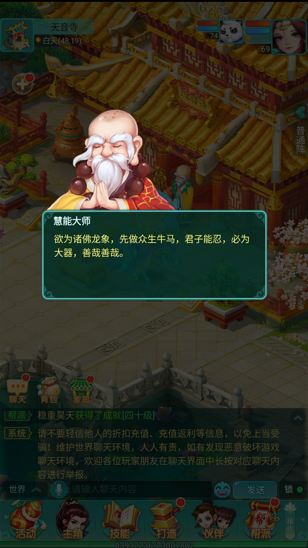 新春佳节即将结束,但为了2023年一整年的好运,可以考虑去寺庙上一炷香,向神佛默默祈祷一下。如果嫌现实中的寺庙人太多太挤的话,可以试试《逍遥情缘》手游中的天音寺。这里同样有灵验的佛像,跟随我来看一看吧。 【面见慧能 传奇僧侣】 虽然身处长安城的闹市区附近,但天音寺却是一处难得的清净之地。进入寺庙后,首先映入眼帘的是一座石桥和一个小池塘。池塘中莲叶青翠,还有两个精致的石头玄武雕像,非常气派。 既然来了天音寺,那么我们肯定要跟天音寺的主持兼门派掌门慧能大师好好聊聊的。这位高僧在历史上可是非常有名的,那首著名的偈子“菩提本无树,明镜亦非台。本来无一物,何处惹尘埃!”就是他写哒。 【佛前祷告 今年好运】 跟掌门聊完后,我们就要开始干正事,也就是拜佛了。地图左上角有一尊嵌在山体中的巨大的佛像,佛像两旁还有罗汉立侍,显得神圣又威严。逍遥世界中运气也是很重要的,快跟佛像求个好运吧。 天音寺除了是一座佛寺以外,还是天音寺门派的大本营。这个门派的弟子会使用他们高超的佛法普度众生,为队友缓解痛苦,给团队提供强大的助力。喜欢救助队友于危难之间的话,天音寺肯定适合你。 编辑:叶子猪小秘书