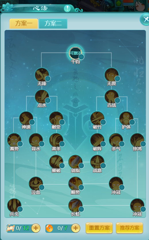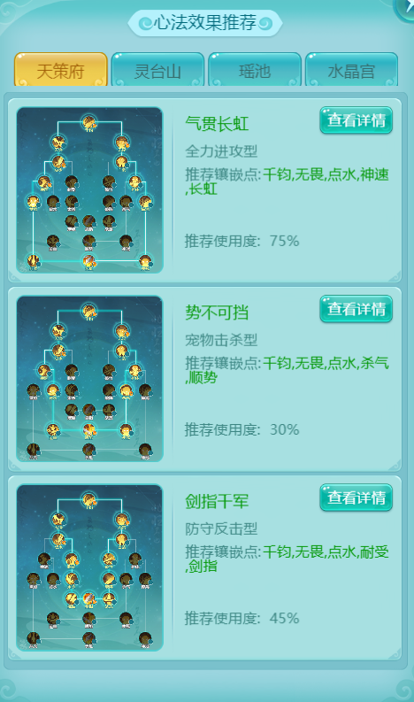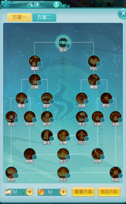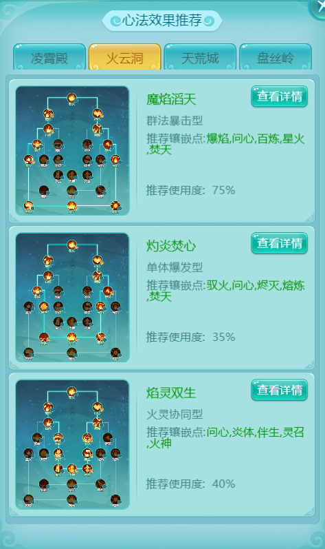 嘻嘻~少侠们晚上好呀 今天带来的是火云洞&天策府的心法技能啦! 一起来瞅瞅呀! 火云洞·心法技能01.心法技能图示 02.推荐方案 我们火云当然要走一波群法暴击哇,看完技能下来,本瑶开始担心自己身上的法防还够不够... 03.心法技能效果 『驭火』 激活效果:提高自身凤火燎原波动下限6% 玉琼效果:使用焰火爆轰临时增加自身人物等级*1的法术强度 『爆焰』 激活效果:焰火爆轰攻击目标的同时附加灼烧效果2回合 玉琼效果:造成法术暴击时有50%概率为目标附加灼烧状态,持续1回合(处于灼烧状态下,回合末或状态被覆盖时都会造成一次伤害) 『问心』 激活效果:队伍中只有一个火云洞弟子时,增加人物和火灵凤火燎原和焰火爆轰3%的法术伤害结果 玉琼效果:队伍中只有1个火云洞弟子时,额外提高5%的封印抵抗,降低5%的被嘲讽概率 『百炼』 激活效果:增加人物等级*0.5的物理防御 玉琼效果:灼烧效果100%概率额外增加2回合 『燎原』 激活效果:自身释放凤火燎原时,提高3%的法术暴击概率 玉琼效果:自身释放凤火燎原击败首目标时,15%概率召唤1个火灵 『凝虚』 激活效果:增加人物等级*0.15点魔力 玉琼效果:火灵释放的法术伤害技能结果提升10% 『焰护』 激活效果:增加人物等级*0.15点体质 玉琼效果:额外增加火灵自身法术强度*0.2的生命值 『烬灭』 激活效果:释放焰火爆轰时,额外提升8%的法术暴击概率 玉琼效果:自身释放焰火爆轰时,对宠物(前排单位)的法术伤害结果增加6% 『炎体』 激活效果:火灵在场时,增加自身等级*0.3的法术强度 玉琼效果:自身释放凤火燎原或焰火爆轰时,火灵有30%概率会对主目标跟随释放焰火爆轰 『星火』 激活效果:使用凤火燎原、焰火爆轰主动击败单位时,为自身附加一层星火状态,每层增加自身2%法术暴击,每回合最多叠加1层,最多5层,倒地清空 玉琼效果:倒地时层数有100%概率保留一半层数(最多保留2层) 『炽热』 激活效果:使用凤火燎原、焰火爆轰主动击败单位时,为自身附加一层炽热状态,每层增加自身2%法术暴击,每回合最多叠加1层,最多5层,倒地清空 玉琼效果:倒地时层数有100%概率保留一半层数(最多保留2层) 『焰灵』 激活效果:每次召唤火灵时,为自身附加一层焰灵状态,每层增加人物等级*0.3点法术强度,每回合最多叠加1层,最多5层,倒地清空 玉琼效果:倒地时层数有100%概率保留一半层数(最多保留2层) 『光焰』 激活效果:释放火之余烬有60%概率多增加1回合 玉琼效果:火之余烬状态下使用法术攻击对首目标造成击杀时有50%概率为自身增加1回合火之余烬状态 『光焰』 激活效果:释放火之余烬有60%概率多增加1回合 玉琼效果:火之余烬状态下使用法术攻击对首目标造成击杀时有50%概率为自身增加1回合火之余烬状态 『伴生』 激活效果:单次承受超过自身最大气血30%的伤害时,有15%概率召唤1个火灵 玉琼效果:火灵释放技能时,有50%概率回复己方2个气血最低目标自身法术强度*0.15的气血 『灼热』 激活效果:释放火之余烬状态下增加自身3%的法术暴击概率 玉琼效果:火之余烬状态下法术暴击概率额外增加3% 『熔炼』 激活效果:释放焰火爆轰击杀目标时,有20%概率为自身附加火之余烬,持续3回合 玉琼效果:焰火爆轰的法术波动下限提高20% 『复生』 激活效果:火灵自身携带神佑复生技能 玉琼效果:火灵在场时,为己方全体人物单位增加火灵等级*0.2点法术防御 『灼焰』 激活效果:自身使用凤火燎原或焰火爆轰时,对灼烧目标额外增加4%的暴击概率 玉琼效果:触发法术暴击伤害时,给目标增加的怒气值减少20% 『风势』 激活效果:自己主动使用凤火燎原或焰火爆轰时,有20%概率对另外一个灼烧状态目标再释放1次焰火爆轰,造成30%的伤害结果 玉琼效果:火之余烬状态下焰火爆轰可攻击隐身单位,对隐身单位额外增加8%的暴击概率 『灵召』 激活效果:每次召唤火灵时,有20%概率为自身火之余烬状态,状态持续3回合 玉琼效果:火灵在场时,增加己方全体人物5%的法术暴击概率(包括治疗) 『焚天』 激活效果:自身主动释放凤火燎原触发暴击时,临时增加自身等级*1.2的点法术伤害结果,自身主动释放焰火爆轰触发暴击时,临时增加自身人物等级*2.4的点法术伤害结果 玉琼效果:对被灼烧或带有点燃印记的目标造成伤害时,法术暴击概率增加4% 『焚天』 激活效果:自身主动释放凤火燎原触发暴击时,临时增加自身等级*1.2的点法术伤害结果,自身主动释放焰火爆轰触发暴击时,临时增加自身人物等级*2.4的点法术伤害结果 玉琼效果:对被灼烧或带有点燃印记的目标造成伤害时,法术暴击概率增加4% 『火神』 激活效果:主动技能,释放时召唤火灵并为火灵附加自身法术强度*0.6的最大生命值,技能冷却10回合 玉琼效果:大招召唤的火灵额外获得自身法术强度*0.4的护盾值 天策府·心法技能01.心法技能图示 02.推荐方案 千军破即将迎来新局面,天策的少侠们,是时候拔剑出鞘、改写战局了! 03.心法技能效果 『千钧』 激活效果:增加人物等级*0.3点物攻 玉琼效果:受到致死伤害时有100%概率保留1点气血,每场战斗仅触发一次 『无锋』 激活效果:增加人物等级*0.5点法术防御 玉琼效果:物理门派技能击败目标,有50%概率扣除目标10%的最大魔法值 『无畏』 激活效果:队伍中只有一个天策府弟子时,增加人物等级*0.5点物攻 玉琼效果:队伍中只有1个天策府弟子时,额外提高5%的封印抵抗,降低5%的被嘲