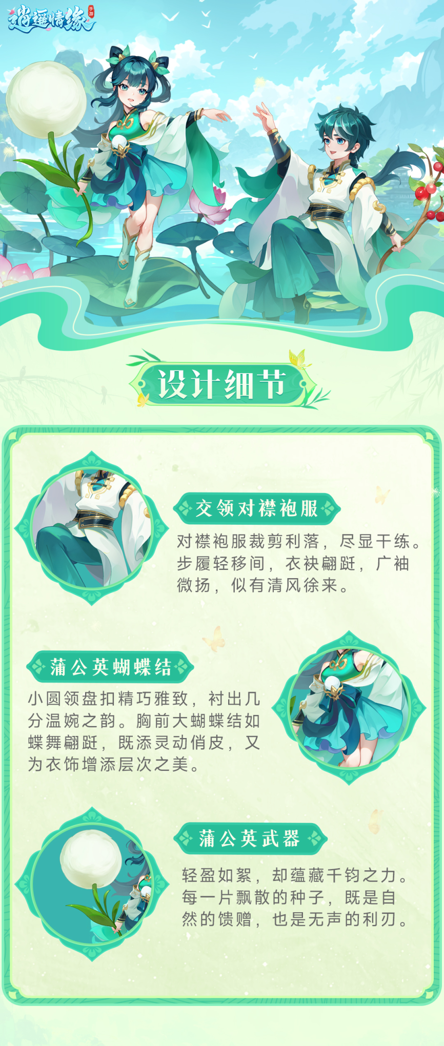 当当!少侠们好呀!春日限定时装,带你走进如诗如画的春日画卷,一起来跟瑶瑶看看啦! 春日时装·悠游踏春 动态展示 01、攻击状态 女时装手中是蒲公英武器 她轻巧的挥动手臂 细小的白色绒毛从武器顶端飘散开来 如同漫天飞舞的雪花 02、施法状态 男时装拿的是一枝蜿蜒藤蔓 施法瞬间 无数叶子在空中盘旋飞舞 像是编织着一场自然的盛宴 染色展示 >海沫蓝 >绛红 >淡雅紫 >嫩绿 海沫蓝令人心旷神怡 绛红热情似火 淡雅紫魅惑神秘 嫩绿可是代表春天的颜色哦! *以上仅为爆料版本* *请以正式上线内容为准* 嘿嘿!春日古风时装这不就来啦! 超期待的! 一起等待上线呀! 更多资讯,请锁定叶子猪《逍遥情缘手游》官方合作专区。 编辑:叶子猪小秘书
