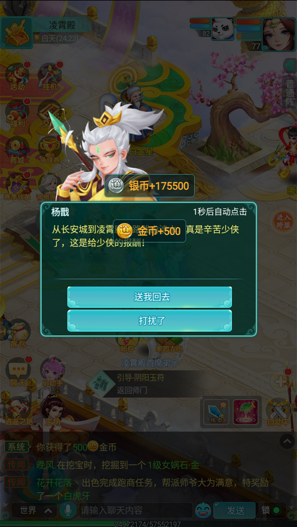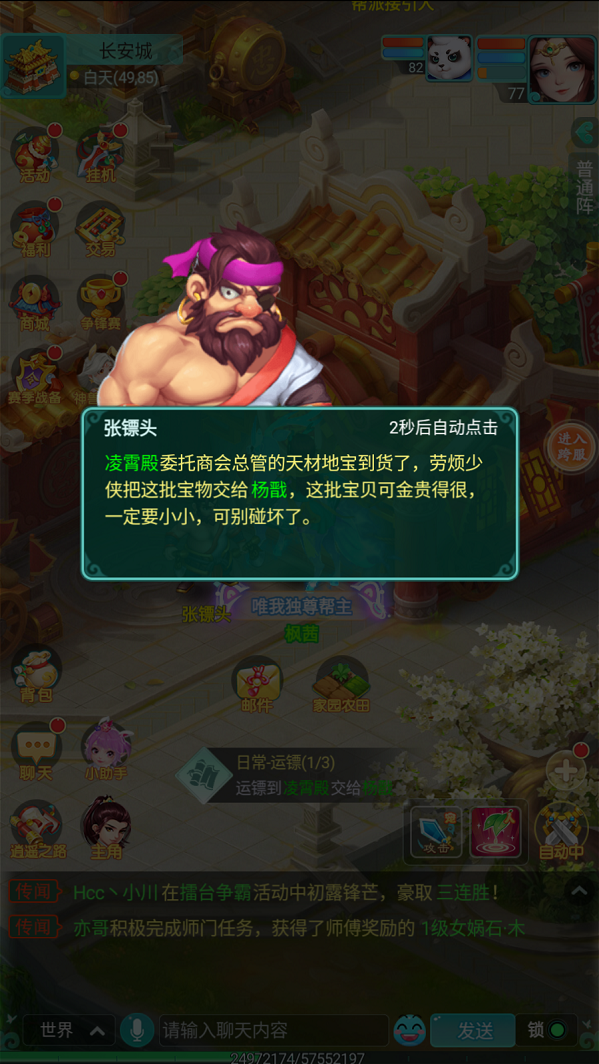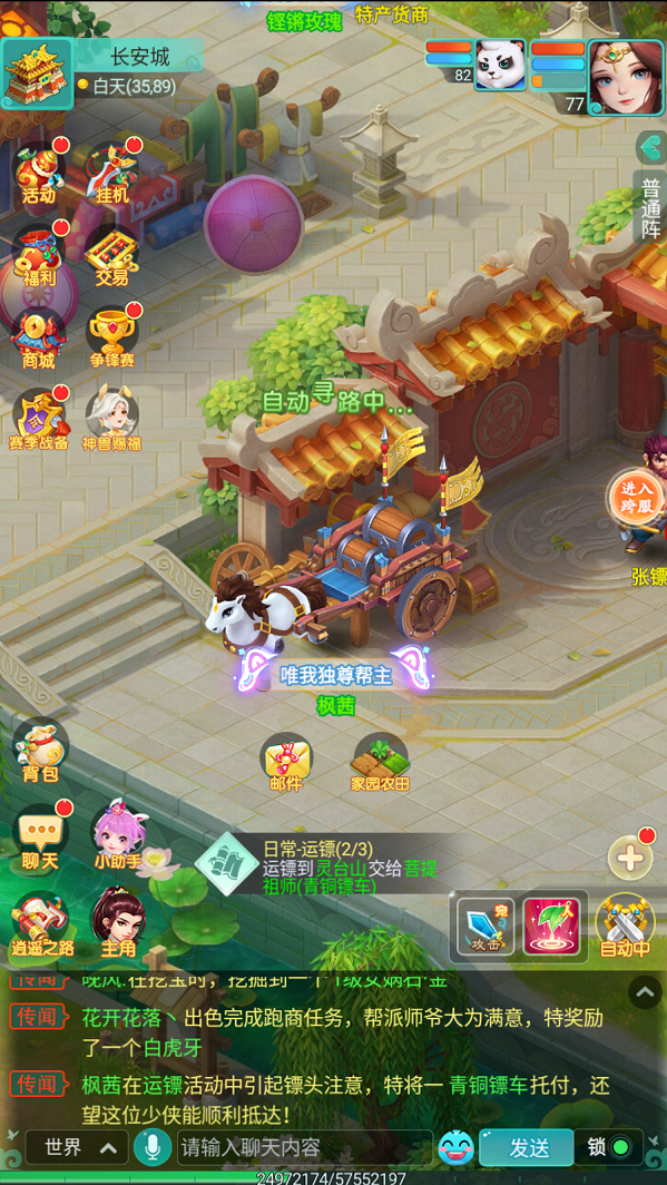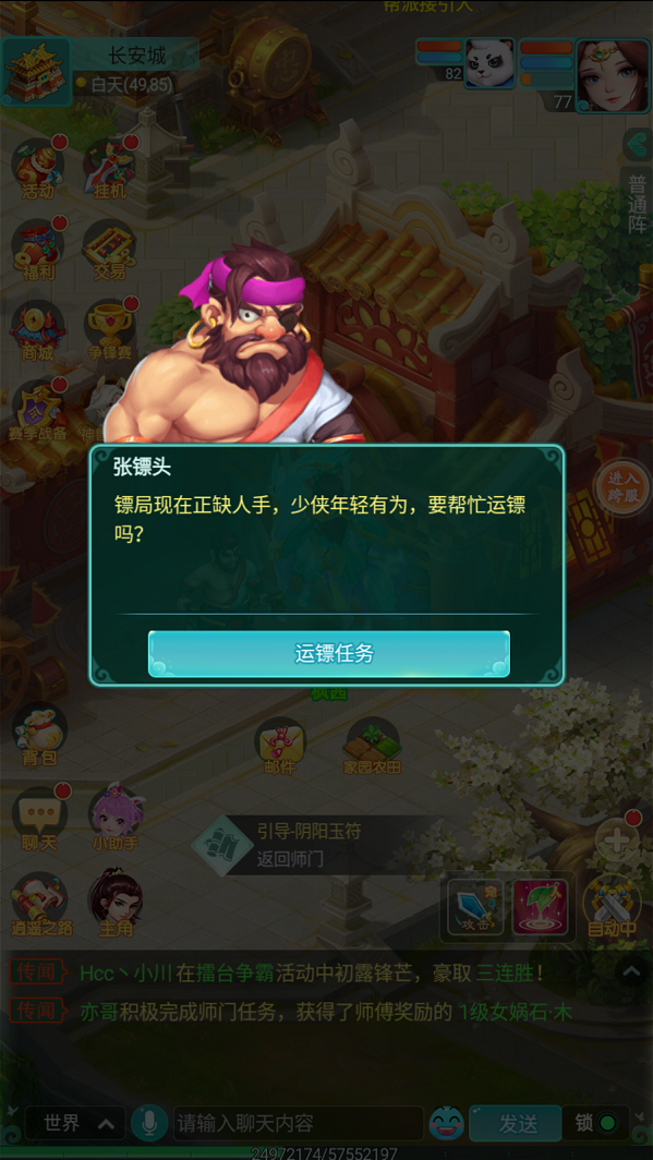我们常常会在电视上看到古代镖局和镖师的身影,其实他们就相当于古代的物流业。古代常常兵荒马乱的,荒郊野外治安也不好,所以很多货物需要武装押运,这就是运镖任务。现在,你在《逍遥情缘》手游中,也可以体验古代快递的惊险工作。 【张镖头处 接取任务】 运镖任务是一个经典的日常任务,在长安城的张镖头处就可以接取。任务手续也很简单,不需要押金和担保,你的任务就是护送一队货物到达目标角色的手中,中间不要被强盗劫走即可。 接取任务后,张镖头会告诉你此行的目的地。接下来,你只需要等待任务自动寻路带你过去就好了。值得注意的一点是,在运镖过程中你不可以进行传送,整个任务全程都只能靠双腿完成。 【特殊运镖 模型变换】 运气好的话,你还可能接到特殊镖,比如像我图中这种青铜镖,接到后角色的模型就会变成一辆马车,非常地有沉浸感。之后,你会在运送的过程中遇到劫匪,击败后就有额外奖励可以领。 每位少侠一天最多可以完成三轮运镖,每次都会有丰厚奖励,是赚取零花钱的不错手段。而且每次做完运镖任务,系统会自动送你回张镖头那里,让你可以继续再接运镖任务,还是很人性化哒。 编辑:月光下完美