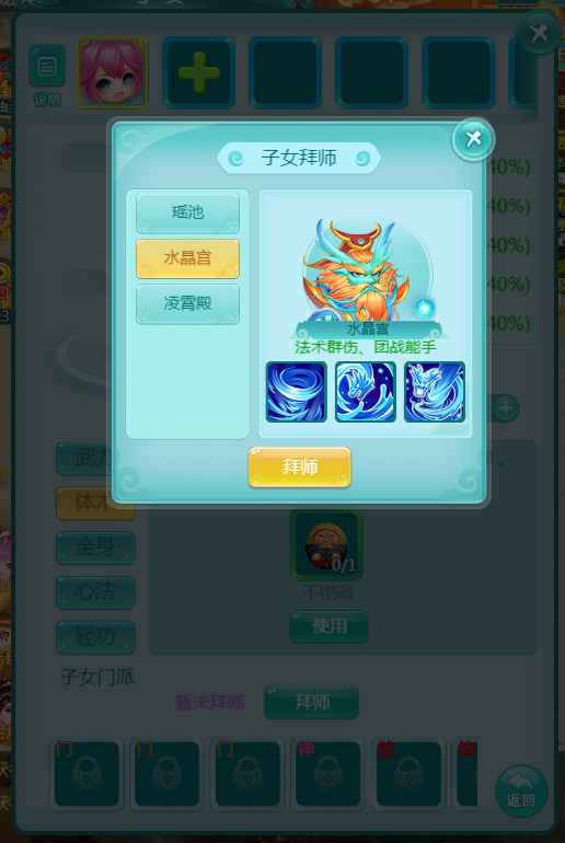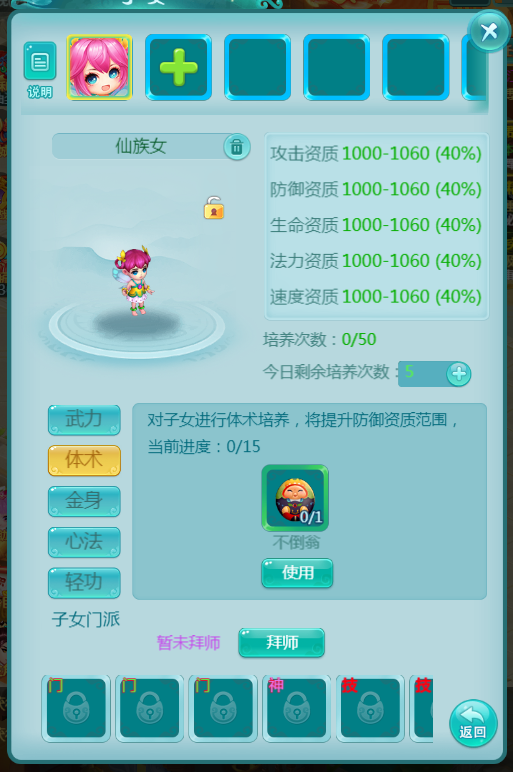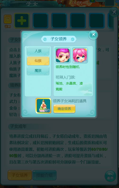 《逍遥情缘》手游中,许多少侠都会养儿子、女儿,倒不是为了养儿防老,而是在给未来培养强大战力呢!原来,逍遥世界里的孩子类似于宠物,在养成之后是可以上场战斗的。而且他们实力不俗,强度堪比神兽,养一个孩子绝对不会吃亏。 【获得孩子 多加教养】 假如你想在《逍遥情缘》手游拥有一个孩子,就需要使用“送子观音”道具。打开子女界面,花钱购买送子观音,纵使是单身汉也能立即拥有自己的娃,大大降低了培养孩子的情感成本。 拥有孩子之后还需要教养,不然长大了也是一个废物。作为一名负责任的家长,应该每天给孩子使用培养道具——弹弓、不倒翁、奇异果、布老虎和竹蜻蜓,来分别提升孩子的五维资质。 【入门拜师 学习技艺】 等孩子成长到了该上学的年纪,你就可以送他去同种族的某个门派里学习知识了。拜入师门后,孩子会掌握该门派的一项技能,并且在后续多次进阶的过程中,逐渐掌握另外两项技能。 拜完师并且培养次数达到50次后,你的孩子就会成年,这时候可以给孩子使用兽诀和子女神功来学习技能。完成这一切之后,你的孩子就算培养完成了,可以在战斗时派上场大显身手啦! 编辑:月光下完美