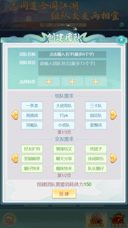 在《逍遥情缘》手游中独自闯荡的少侠,还在为独闯江湖,缺乏队友而发愁吗?告诉你一个好消息,全新团队功能现已上线,一键解决你的组队难题。活用这一新功能,你就将从此告别“孤狼”刷本!现在,我们来看看这个新功能的细节吧。 【创建团队】 点击游戏主界面右下方十字按钮展开菜单后,点击“团队”即可进入界面。在团队招募中,你可自行创建团队。值得一提的是,你可以选择一些组队需求和交友需求的tag,帮助志同道合的少侠能精准加入你的团队。 填写完成后,其他少侠可在团队招募主页看到你的招募信息!所以把招募信息写的有趣点,有助于更多少侠加入你!加入团队后,可与其他团队成员拥有专属私密聊天频道,并可以一键邀请团队内在线的所有成员。 【个人找团】 如果你不打算创建自己的团队,那就加入别人的团队吧,这就需要用到“个人找团”了。在个人找团中,你可以自行创建“我的名片”,系统会要求你输入个人宣言,然后选择tag,流程和创建团队其实很类似。 对于腼腆又害羞的少侠,那就挂上自己的个人找团名片,等待需要你的团队来邀请你吧,也是个不错的方式。独狼的时代已经结束,全民参团的时代到来!相信你会在团队中找到志同道合的朋友,享受游戏的乐趣。 编辑:月光下完美