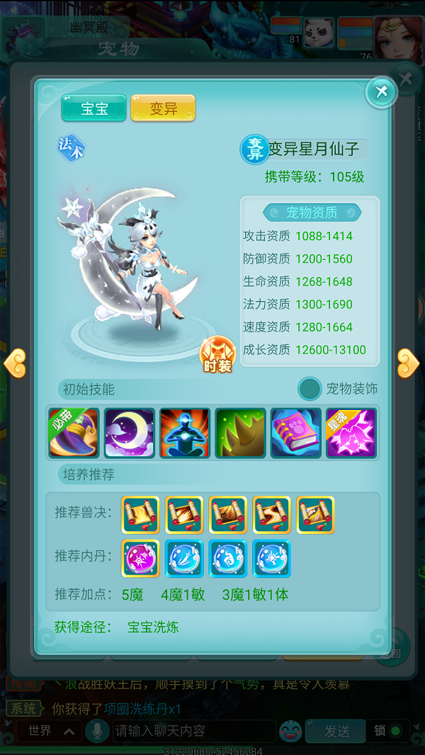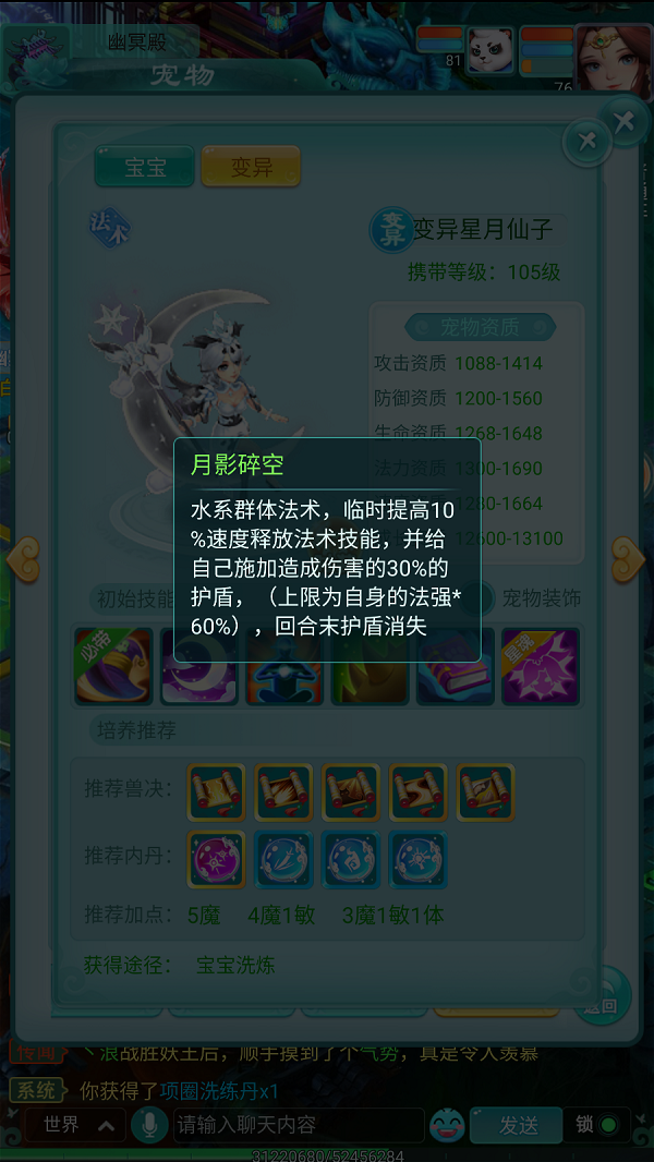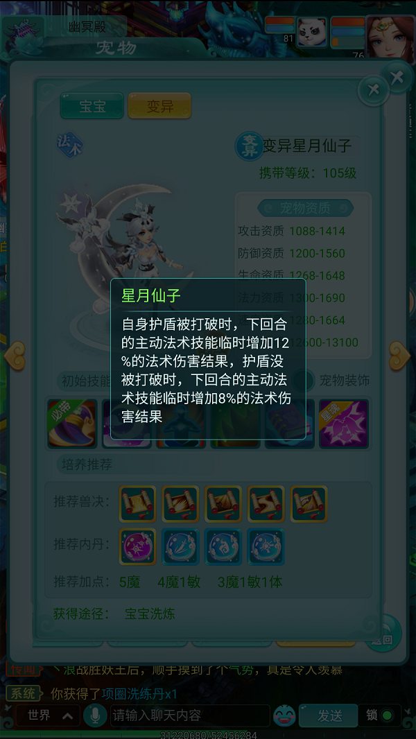《逍遥情缘》手游中,哪一只女性宠物最好看?我想星月仙子绝对是其中的有力竞争人选。这是一位坐在月亮上的大姐姐,许多少侠的梦中情人。而且她也不止是长得好看,其实力也强大,绝对不是花瓶。今天,我们就来领略一下星月仙子的无上魅力吧。 【典雅高贵 美不胜收】 星月仙子是一位端坐在弯弯月牙上的优雅大姐姐,手持一根华丽的魔法权杖,一双大眼睛十分水灵,秀发就像绸缎一般柔顺。她的穿着也典雅上流,宛如宴会上会穿的晚礼服,美不胜收。 从资质上看,星月仙子是一位全方位发展的法系宠物,能力方面有三项资质(生命、法力、速度)都在1600以上,可谓毫无短板;她最厉害的法力资质居然高达1690,可谓是超一流法宠了。 【攻守兼顾 毫无破绽】 星月仙子的特殊技能是月影碎空,这是一个群体法术,释放时会临时提高速度,抢占先手。用完后还会给自己附加一个造成伤害30%的护盾,护盾持续一回合,让本来就肉的仙子更难被打死。 仙子的星魂技能与月影碎空十分有配合。她的护盾如果被击破,则在下回合主动施法时增加12%法术伤害,否则就是增加8%法术伤害。这样攻守兼备的星月仙子,绝对值得你培养为主力宠物。 编辑:月光下完美