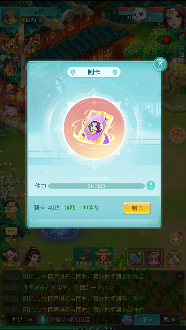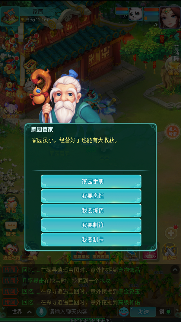 在《逍遥情缘》手游中,体力是一种重要的特殊资源,可以消耗掉用来烹饪食物、炼制药品、制作附魔符以及变身卡。不过如果你准备要做以上这些事的时候,我建议你还是回家园去做,因为只要利用好家园的功能,就有可能让你的产出翻倍! 【家园管家 为你服务】 每个家园里都有一位管家,就站在房屋门口的右手边。跟他老人家搭话以后,可以看到选项里有“我要烹饪”、“我要炼药”、“我要制符”、“我要制卡”等选项,说明在家也是可以完成的。 【一定概率 产出翻倍】 而且,在家进行生产工作,就有概率得到两倍产出,比如做一次菜得到两份菜肴之类的。这个概率的高低跟家园的舒适度密切相关,只要家园环境度越高,风水越好,就越有可能实现双倍产出。 【多放家具 改善环境】 打开家园信息界面就可以看到自己家园的环境度了。想要提高环境度,你可以在家园里多摆些家具,每一件家具都会提供少许环境度。此外,给房屋建筑升级也可以提高环境度,让家园更宜居。 编辑:月光下完美