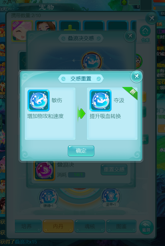 宠物内丹是《逍遥情缘》手游宠物养成系统中非常重要的一块内容,可以大大强化宠物的实力。如今,这个系统也迎来了升级,新增了全新的内丹交感系统,可以让养宠体验直接起飞。那么到底啥是交感呢?我就来给大伙讲解一下吧。 【内丹交感 消耗内丹】 高级内丹升级到最高阶——超阶后可进行交感操作(低级内丹未镶嵌也可进行交感操作),每次交感都需要消耗固定的对应高级内丹。完成交感后,将会获得一条低级内丹交感。 【低级内丹 效果升阶】 内丹进行交感后,若其镶嵌有对应的低级内丹的话,则将该低级内丹升级一阶效果(镶嵌的低级内丹需达到高阶后才可触发提升一阶效果,交感后可突破超阶效果)。 【交感重置 刷新效果】 当前已有四个已激活的低级内丹交感效果,则可以选择其中一条进行重置,重置后出现新的一条交感效果。卸下高级内丹时若存在交感,则根据已增加的交感数量返还一定数量的对应高级内丹。 编辑:月光下完美