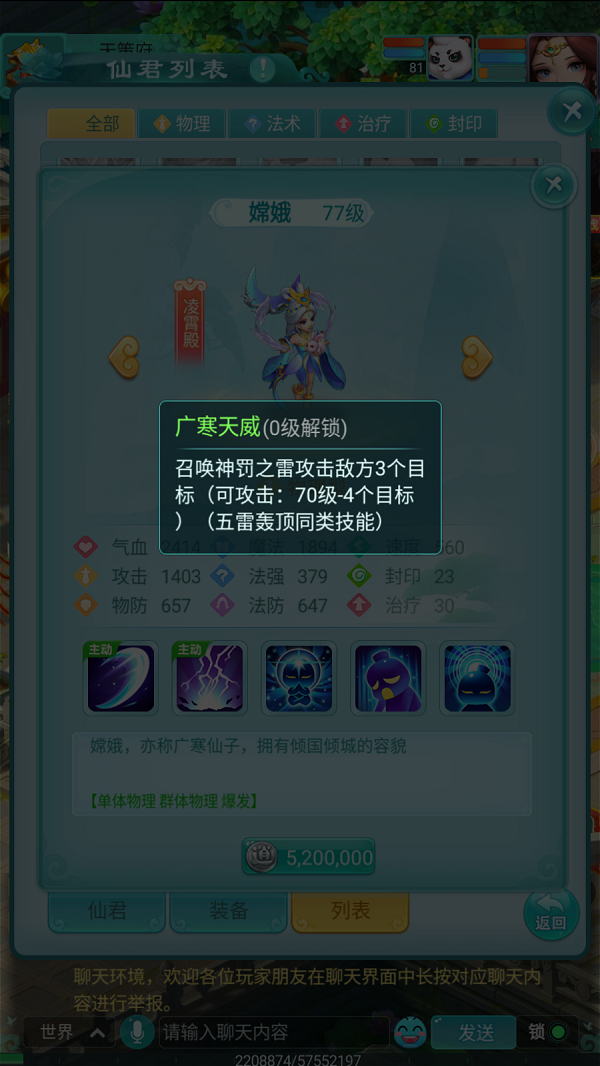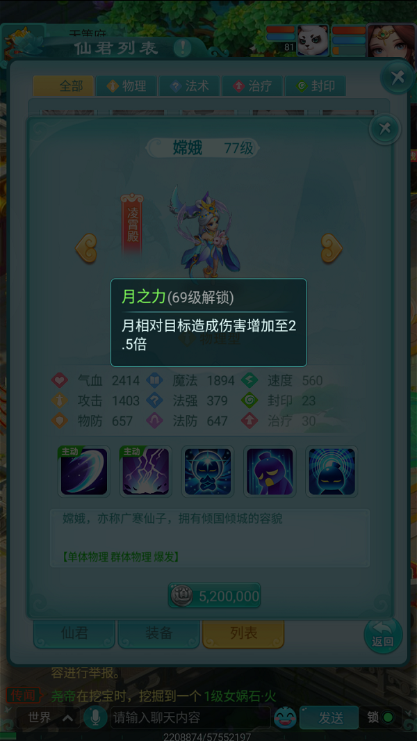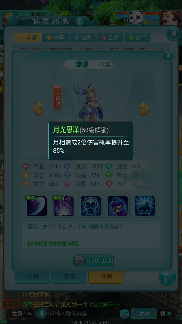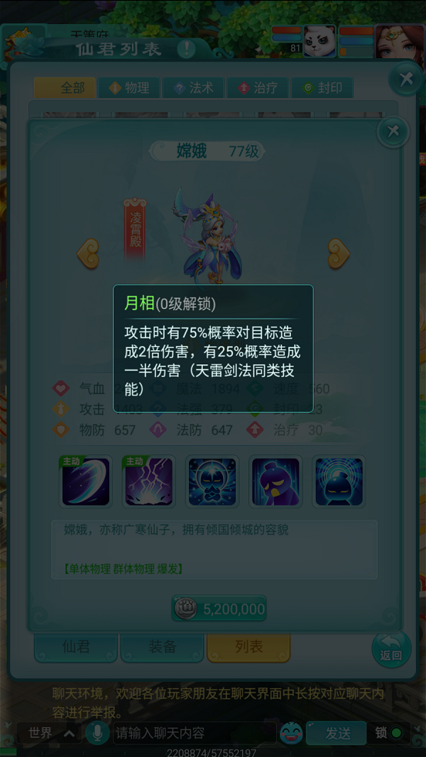 嫦娥,在传说故事中是后羿的妻子,第一个飞升到月亮上的人类。嫦娥长得漂亮,不过应该不太擅长打架吧。但是在《逍遥情缘》手游中却未必是如此,嫦娥作为一名仙君,不仅伤害非常高,而且都是物理伤害!想想吧,娇柔美貌的嫦娥仙子,抡起拳头就上去了...总之,今天我们就来了解一下凌霄殿的物理型仙君——嫦娥吧。 【月相攻击 概率出伤】 月相是嫦娥的主力技能,75%概率造成2倍伤害,25%概率造成一半伤害。这个技能赌的就是心跳,虽然造成2倍伤害的概率3倍于造成一半伤害的概率,但如果不幸触发一次,还是挺难过的。 另一个主动技能广寒天威就比较朴素了,是嫦娥的主要群体攻击手段,召唤神罚之雷攻击多个目标,最多可以同时攻击4个敌方目标。看来广寒仙子嫦娥发起怒来,也是很有压迫感的啊。 【被动技能 强化月相】 如果你觉得月相这个技能不稳定,可以用50级解锁的月光恩泽技能来调整。这个被动的效果是将月相造成2倍伤害的概率提高10%,也就是达到85%,相应的造成0.5倍伤害的概率就只有15%。 嫦娥还有一个被动技能月之力可以进一步提高月相的力度,让原本的2倍伤害提高到2.5倍,简直是更加粗暴了。在这些被动技能的辅助之下,嫦娥的月相稳定多了,可以有效击伤敌人。 编辑:月光下完美