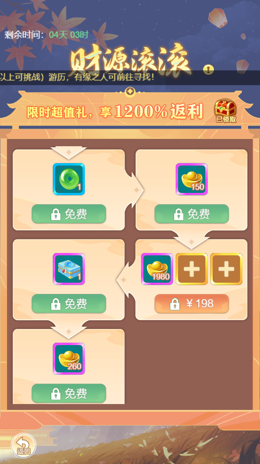 一个人能不能发大财,除了要看个人的赚钱水准,还要看有没有那个时运,发财这件事有时候就是很不讲道理的。今天,我们就来《逍遥情缘》手游参与两大特色活动,试试你的手气吧。没准儿,你马上就要时来运转咯。 活动时间:11月10日-11月16日 【时来运转】 在活动期间,任意消费元宝+绑元合计200个,可获得1个抽奖道具。以下内容不计算在内:①元宝和绑元的相互转换。②元宝或绑元兑换金币、银币。③寄售购买消耗。 抽奖道具获取上限为36个,累计获取达到36个后,再进行消费不会获得抽奖道具。抽奖为不放回抽奖,全部抽完后,奖池也不刷新。希望少侠能早日搬空奖池哦! 【财源滚滚】 活动期间可按照顺序依次领取礼赠礼包,领取当前礼包后才可解锁下一阶段的礼包,不可跨顺序领取。部分奖励内容可以自行选择,选择完成后,在领取之前都可以进行自由更改。 编辑:月光下完美