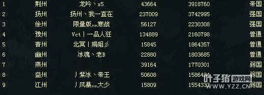 先从第一荆州来说,荆州在排行上是帝国,但是占领皇城的是扬州,龙吟公会一直存在在这个国家。荆州的实力也是相当不凡,但是打过两次皇城都没有成功,直接来看应该是实力还达不到扬州的程度。但是x5这个人还算领导有方。没有太多敌对国家 第二名扬州,从开区到现在一直稳占皇城,实力自然是世界第一,北狼公会果然不是盖的,国王小手不知道为啥近期改名了,是在对抗那些说要自己退服的流言吗?前期荆州扬州非常友好,近期因为某某事关系分裂成了敌对。因为啥呢,大概是一山不容二虎吧,荆州太强大小手不想看到。 第三名徐州,刚刚介绍了徐州大象实力相当,寒战也是很低调,不去他们国家做任务,见到他的概率为零,手下的兄弟倒也是实力非凡。大手层出不穷。 第四名豫州,豫州最近跟荆州结盟,看似更加嚣张跋扈。敌对国家不少。前些日子跟着荆州一块打了扬州的皇城战。但是遗憾失败。怎么说人家也是有嚣张的资本。国王人如其名,一品、人狂。 第五名、第七名青州燕州实力相当,天天想着刷弱国招新人,下王,甚至不开镖局。本人认为太刻意做到某件事的时候,你的得到或许会大过你的损失。值得说的是上周青州还是开疆拓土的宗主国。每天一两黄车经验,也是蛮不错的。 第六名、第八名、第九名幽益江三国实力相当,国家相对比较薄弱。 注:本区十六号刚110破封,十八号最高级为一百一十七级。期待合区的到来。 叶子猪记者——猎龙 |