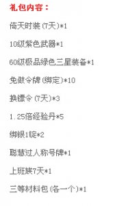 推荐阅读: 御龙小技巧20条 老手都不一定知道技巧 时装加成突破天际!御龙史上最牛逼时装 1:QQ安全中心礼包 http://aq.qq.com/cn2/manage/mbtoken/app_privilege?id=yl&source_id=2475 2:电脑管家活动 http://yl.qq.com/cp/a20150128ylgj/index.htm 3:QQ会员活动 http://youxi.vip.qq.com/game/zhuanqu/v5.html?id=yl 4:五城之约活动 http://yl.qq.com/act/a201412155city/ 5:全民福利礼包 http://hao.17173.com/gift-info-22878.html 6:腾讯游戏平台(需登录攒兑换券) http://tgp.qq.com/index.shtml 7:御龙在天叶子猪热战礼包 http://card.yzz.cn/fahao-3174.html