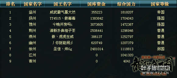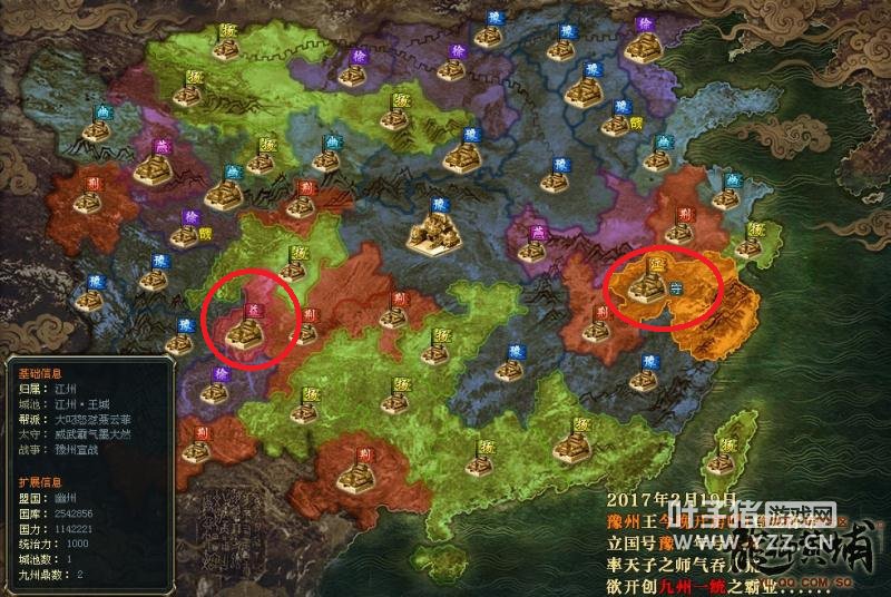 豫州是强国,国力一百多万,但在世界核心战力榜上拥有的高战却不少,九州一统大地图上的城池很多,本方城池无一丢失,数次夺取过皇城,并且灭国青州,可见豫州的实力很强,不过在1月22日灭国益州的过程中因为分出实力反江州王而导致失败。 江州是【金马同庆】曾经的强国,后来因为国内矛盾导致家族和玩家流失,实力越来越弱。又恰逢豫州安排的反王家族落地江州,打下江州王城。江州原王帮无法力战,部分家族和玩家选择退出江州,进入与豫州对抗的扬州,江州被豫州成功控制,2月19日豫州对江州发起灭国战。