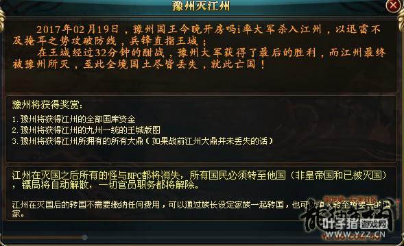 2月19日晚上7点50左右,豫州和江州之间的灭国战即将开始。江州QT指挥上麦,并没有传来准备要防守的讯息,而是在国家呼叫王帮和散人玩家进入王帮歪歪,商议灭国之后的转国事宜。8点灭国战正式开始,豫州如入无人之境进入江州,迅速爆掉镇关守将和金甲将军,直接进入内城,输出朱雀和玄武。而此时江州QT指挥正带领江州国民和其盟国幽州在围堵扬州镖局,并且还在要求江州玩家不断下边,源源不断支援扬州镖局,对国内灭国战一点也不关心。8点20左右,承载江州玉玺的马车从王城郡守位置启程,江州几乎无人防守,玉玺马车在豫州大军的簇拥之下被安全送达阳平关,江州宣布亡国。