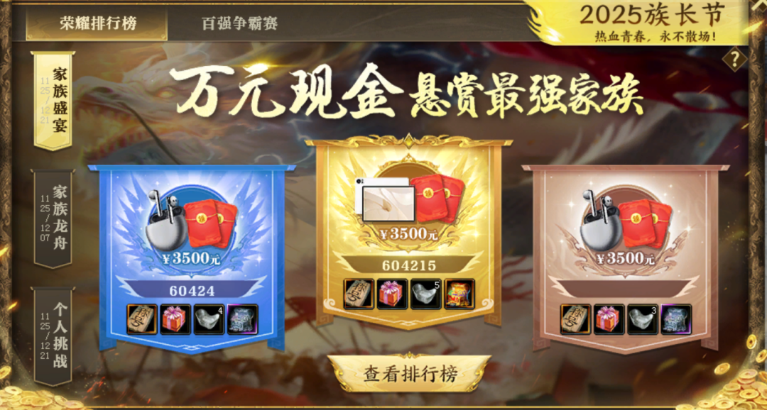 敬的御龙将军: 为了感谢将军们对《御龙在天》的热情参与和支持,同时为了给大家带来更好的游戏体验,我们将于2025年11月25日对全区全服进行更新维护!为此给您带来的不便,我们致以最诚挚的歉意!维护期间欢迎您进入《御龙在天》官方wegame社区与更多玩家讨论更新内容以及相关精彩活动。 维护时间:11月25日8:00-10:30 维护范围:全区全服 最新客户端版本号为:1.0.9.907 【更新福利】 版本更新后,截至本周日,40级以上将军可在王城(626,563)“暖心小双”处领3000绑金+5锭绑银+上班族减负7天的版本更新福利。? 热血青春13载 兄弟携手赢万元现金大奖! 九州大陆热血征伐,家族是每位将军最坚强的后盾,是兄弟情谊最温柔的港湾;有家族兄弟并肩同行,无惧征程艰险,可抵岁月漫长;九州之内皆兄弟,一声兄弟一生情,13周年族长节热血开启! 全新族长节版本重磅上线,争夺荣耀家族排行榜,书写最强家族故事,赢家族线下聚会基金、电子周边、精美手办。全新百强家族争霸赛同步震撼开启,全区顶尖家族碰撞,激情赛事酣战不休,更能豪夺万元现金大奖、冠军龙雕像、永久称号犒赏! 1、全服巅峰决战 万元悬赏最强家族 25年族长节版本的盛大开启,一场全新的百强家族联赛点燃战火。全区全服最强实力家族将集结一堂,汇聚在同一个战场中,为终极荣誉展开巅峰对决。11月27日至12月14日,各家族成员登录专属百强家族赛事服,历经百强争夺、海选、小组赛、淘汰等环节的激烈角逐,最终在冠亚军的决战中一决高下。获胜的家族将荣获万元现金大奖、“热血青春”限定称号、以及至尊龙雕像手办,九州大陆之中的最强家族将花落谁家,让我们拭目以待! 注意:赛事服将拷贝本次更新维护前(11月25日8点)将军们角色和家族信息,拷贝结束后在赛事服内无法退出/加入家族,且正式服后续的家族变更操作不再影响赛事服家族信息。 2、族长节兄弟相聚 领3500元聚会基金! 本届族长节活动,完成家族盛宴、龙舟和个人挑战任务,即可累积家族荣耀积分,积分越高,获得奖励也越丰厚。除了”热血青春“限定称号、飞龙落羽时装、绑银等奖励,更有HUAWEI平板、耳机、京东卡、河图龙马纪念手办等实物大奖,同时,本届家族荣耀排行前10的家族可额外获得3500元的家族聚会圆梦基金,让兄弟情谊延续!快和兄弟们一起来挑战吧! 家族聚会圆梦基金规则说明: 1)12月21日荣耀家族排行活动结束时,前十的家族族长将会获得3500元额度的聚会圆梦基金的领取资格; 2)聚会圆梦基金专项用于前十家族举办线下家族聚会(人数不得少于4人,聚会时间在获得领取资格后的30个自然日内,工作人员会主动联系对应的家族长确认信息),家族成员需要在聚会过程中保留相关的凭证(发票、支付记录等),并按官方要求拍摄聚会照片/视频(需含御龙元素装饰,如官方指定横幅,家族名称标识等),在聚会结束后提交给官方工作人员; 3)我们将在收到聚会凭证后5个工作日,完成聚会真实性核验,确认聚会真实后向家族族长发放3500元的聚会基金; 4)我们将会保证家族成员的个人隐私,如家族拍摄的聚会照片计划做公开宣传使用,我们会提前通知家族成员,并按需做隐私保护处理。 凛冬之王 冬季三国志跨区征战开启 活动时间:2025年11月26日12:00-2026年01月23日23:00 区服分组: 第一组:公测服、热血怀旧服全区服 第二组:原始服、真金服全区服(【帝御山河】【威震天下】【义聚九州】不参与) 神魔三国志简介: 1、神魔三国志战场中,角色属性将改成由经过平衡后的属性和神魔装备属性构成; 2、攻打资格确定后,双方军团长可在版图界面对当前场次的战斗选择种族阵营,获得增益BUFF; 3、守城名将在刷新时有概率刷处神魔名将,可在夺城战中为守方军团提供增益BUFF; 4、三国志战场中击败敌人有小概率掠夺其穿戴的神魔佩饰至军团中,在战场结束后随机平均分配给参战人员。 赛事规则: 1、本期神魔三国志2个分组均开放全版图的128座城池; 2、成为三国志皇帝的条件为:同时占领许昌、成都、建业及洛阳,要求占领城池总数达到88个,满足条件时立即获得“华夏之王”称号(城池占领不满足时失去称号); 3、成为三国志魏/蜀/吴王的条件为:占领许昌/成都/建业中的任意一个,要求占领城池总数达到30个;且每个赛季最多激活一个王的成就,满足条件时立即获得“魏王”“蜀王”“吴王”称号之一(城池占领不满足时失去称号);赛季结束时仍穿戴的“魏王”“蜀王”“吴王”“华夏之王”称号,将持续生效至下一个三国志赛季开始; 4、三国志赛季开启期间,限制转国名额将下调为每天3个(其中【九州争锋】【金蛇揽月】及原始服焕新服所有服务器仍保持现有转国规则); 5、每天根据占领的城池数量,军团成员可以获得对应的占领奖励;三国志战场内每天最多可获得的御龙徽章数为200个,更多御龙徽章可在“每日占城奖励“获得; 6、三国志赛季结束时,将根据军团的占领城池情况发放大荒金乌、丰厚金子、橙色神魔法器精源等赛季奖励;预计12月2日版本更新后,真金服的徽章商店新增限量人装和马装的紫色打造材料包兑换。 7、成为三国志皇帝或者称王的玩家,载入三国志史册后,可在C界面或者角色查看界面点击荣耀印记查看光辉的历史。 详细规则说明可查看游戏内热情帮助或移步>>官网资料站-神魔三国志 【活动内容】 1、百强家族争霸 竞猜冠军赢飞马 >>点击文