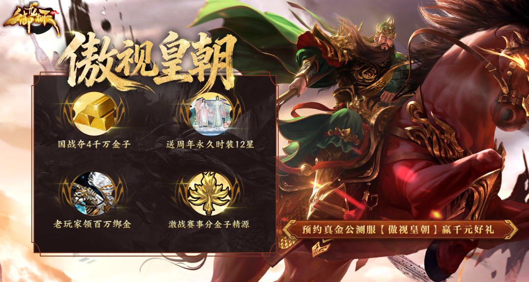 真金公测服【傲视皇朝】 今日16:00震撼开启! 双旦盛典狂欢 送现金、周边、实物好礼 升级调优极速70级 夺金国战 多重赛事 爽赢4000万金子 诚邀将军重回真金新版本 再掀万人国战狂潮 真金新版本优化·极速升级 武勋加倍 大幅提升主线经验、任务寻路速度,新服首日开系统国运和投保经验加成,拉车经验200%提升,同时国战、皇城战、木牛战场武勋获取双倍加成,爽快征战九州! 年终盛典狂欢·双旦真金福利加码 喜迎岁末双旦嘉年华,丰厚福利即将起航,参与新服双旦狂欢、豫行洛阳、凛冬战令、约定同行活动,领取珍稀坐骑、精美时装、紫色称号、黄金精源碎片奖励,抽取京东卡、实物周边奖励;同时,年终新服九阁令真金升级,达成任务目标可赠送丰厚金银犒赏助力将军战力成长,夺取更高荣耀! 国战联赛 夺金爆银 全民参战即可瓜分2500万金子奖励,更有赛事限定时装坐骑和黄金精源碎片犒赏,角逐战神榜还有绝版称号等诸多好礼! 抢王夺皇 赢千万金子 新服在位皇帝累积时间排名第一可获得200万金子、真龙大帝称号、华为Pura 70 Pro旗舰机,彰显帝王荣耀!国战正式战获胜场次最高国王,可获得200万金子、天命王者称号;获胜场次排名第2/3-5/6-8/9名国王,分别获得150万金子、100万金子、50万金子和天命王者称号 兄弟同心 家族称霸 参与新服巅峰家族赛可瓜分百万金子、黄金精源、淬炼宝石及限定称号大奖,巅峰家族赛新增32强淘汰赛,巅峰对决,冠军登顶! 夺金抢银 黄金镖车 新服将开启黄金镖车、猛龙过江、木牛流马砸车赛事玩法,个人通过完成军需任务、各类砸车玩法拾取丰厚金子掉落,并瓜分赛季百万金子、幽冥龙等及黄金精源等珍稀奖励! 真金归来·感恩回馈 13周年最强福利,全民领取13周年永久时装、12星强化卷或12星保星符任选、星特权、13周年永久名字牌、橙色换镖令、五等星辰石等重磅豪礼。 五虎成团·预约领千元专属礼 五虎成团,立即预约即享限定经典金麒麟、双鱼座时装、龙将军头像等千元好礼。呼朋唤友组队下新服,还有多重奖励叠加。>>点击文末“阅读原文”预约新服 老兵犒赏·百万绑金静候诸君 老玩家回归纯粹经典御龙,参与角色鉴定,最高可领100万绑金、360天青龙限定头像框至新服,不容错过! 编辑:月光下完美