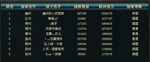 推荐阅读: 御龙在天马类大百科之各级马外观一览 蛇蟠阵是什么?御龙新副本石兵八阵猜想 【傲视神州】从开区至现在也是经过三次合区而来,而今也150封印很久了到1月29日也要破封印了看来又是一场激烈的角逐啊。 现在看看帝国幽州,虽然“无限”没有当王了也依然是帝国,国力也是依然强大高战更是越来越多,看来一个国家换了个国王只要人还在依然是实力不减当年呀,在封印期间当然是很无聊的,但是就在19号当天也是发生了一场激烈的国砸,对于其他国家而言幽州可谓是猛虎下边砸车那当然是不在话下很快就可以砸到王城镖局,不过当时就在无限的一个禁卫军令下结束了这场战斗,然而并没有结束就在当天下午幽州开国运荆州来报仇,果然是士别三日当刮目相看也是砸了幽州的十几辆镖车在此强大的幽州看来能被砸几辆车那也是耻辱啊,何况是砸了十几辆呢,看来后面会有更激烈的斗争了 “馒头”刚开始拉的第一辆车被“血哥”偷袭,之后当然是不服气了祈福镖车无敌然后诱敌下边砸车,“馒头”将没有换的白色镖车拉倒边境然后幽州立马带大部队下边想砸没馒头的车,结果刚碰到车发现一直免疫才知道“馒头”镖车无敌没办法只好回去了,这完全是对幽州一个很大的挑衅啊发现有这个无敌的镖车真是很赞,可以各种挑衅敌国还砸不破车呢?丽儿经常这样嘲讽人家不知道你们试过没? 现在【傲视神州】服务器有三个18星,在22号上午就来了一个轮番PK让九国玩家大饱眼福那场面可激烈了。 燕州的“老烈”对阵益州的“拽爷”,在一场激烈角逐下“老烈”败下阵来不知道是装备没有“拽爷”好还是怎么的,估计肯定也是不服气的。 其实大家很想知道的是“嗨起”为何归隐了吧,到150级封印期间估计没事的高战肯定是在七星坛泡着了因为里面的奖励的确是颇为丰富那么为了抢怪打起来闹矛盾那肯定是常有的事儿了,“嗨起”为此也对本国家族进行多次调停,但是结果却不尽人意本来“嗨起”也是接着“淡然”来管燕州的,既然现在这样他也是没必要再管下去了,由此宣布归隐,不过不知道是不是真的归隐,反正燕州是换王了。 2015年1月24日也就是前天才打完皇城站看来江州还是实力不如幽州没有拿下王呢,丽儿是很支持江州的毕竟我也是江州的呀,希望能好好发展最终取得胜利。 1月26日有2场国战,豫州跟江州也原本是暗盟估计也是互刷了,比较有看头的就是益州和幽州的国战本来就是2个有仇的国家,就看江州是不是会放弃国战去帮助益州了,有了盟国的加入才有看头嘛。
